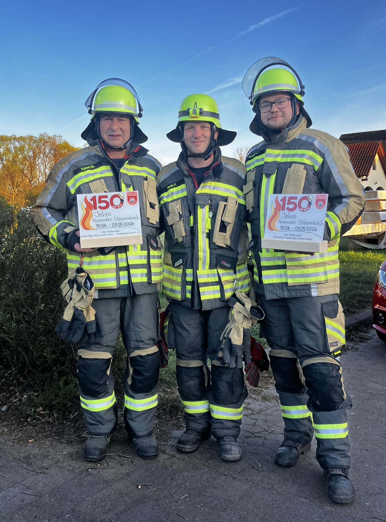 Der 1. Vorsitzende des Freiwillige Feuerwehr Stappenbach e. V., Pascal Martin, überreicht als Anerkennung für die Übernahme der Patenschaft zum 150. Bestehen der Wehr, an Christian Kaiser (Freiwillige Feuerwehr Ober- und Unterharnsbach) sowie Jonas Bergrab (Freiwillige Feuerwehr Unterneuses) eine Festtafel. Darauf zu sehen ist das offizielle Logo für das Jubiläum, das vom 30.4.-3.5.2026 in Stappenbach gefeiert wird.