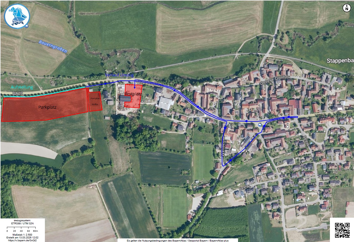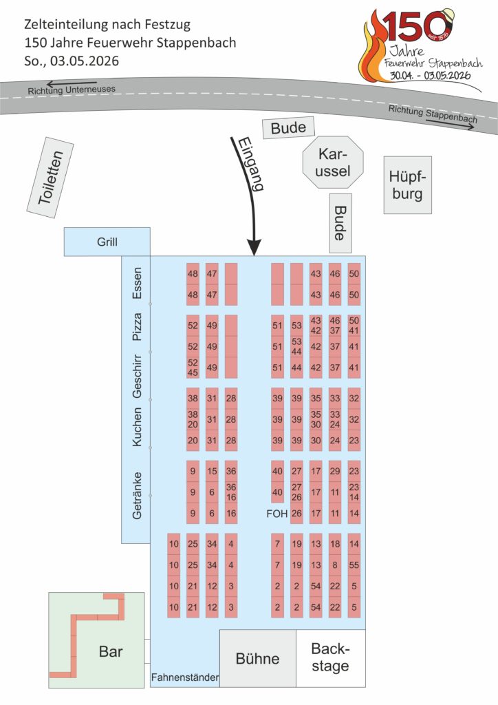 Die Aufstellung zum Festumzug am Sonntag, 03.05.2026 um 13:30 Uhr findet zwischen der Don-Bosco-Schule Stappenbach und dem Festplatz (Lagerplatz Bau Hartmann, Stappenbach 6, 96138 Burgebrach) statt.